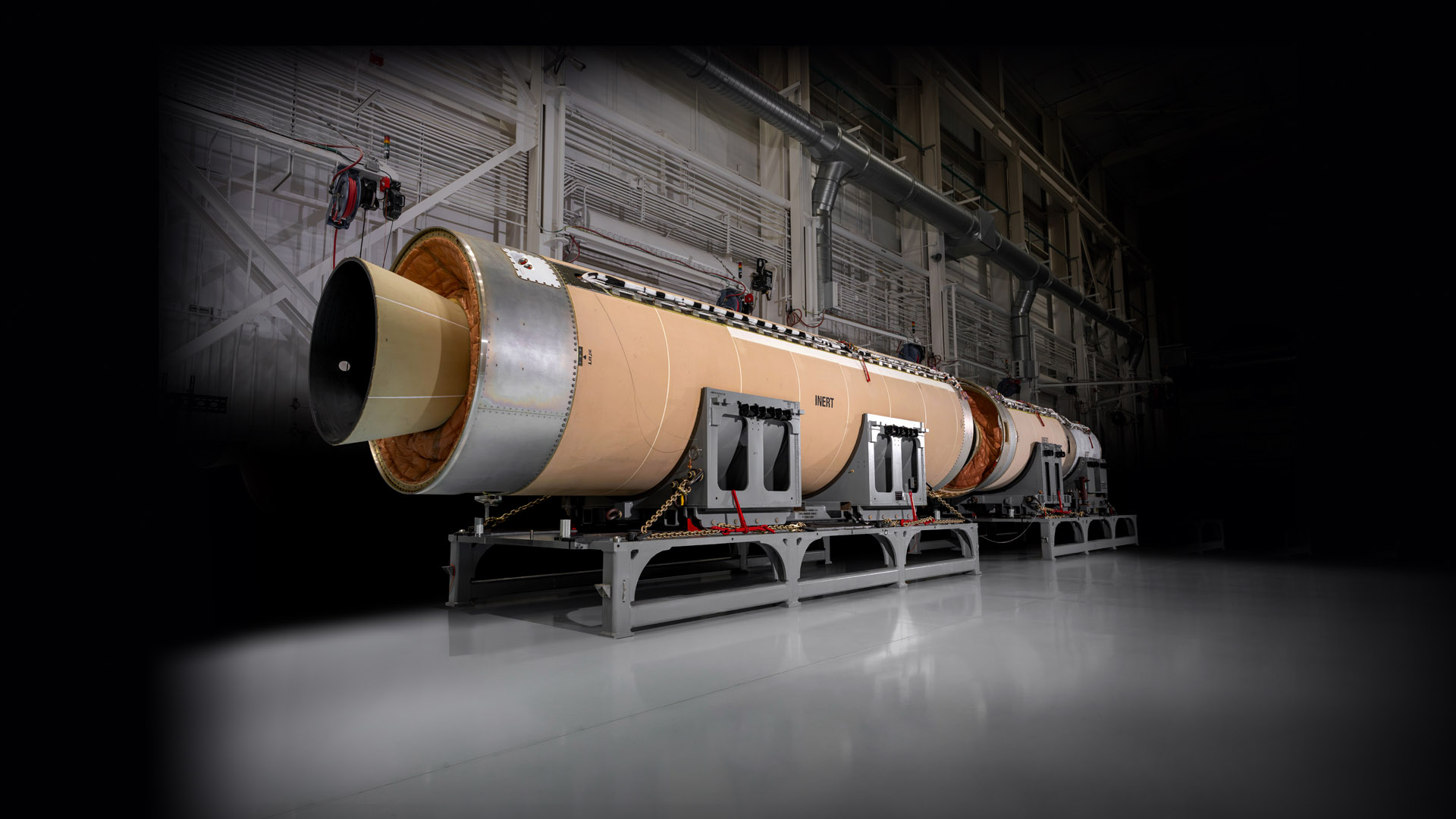 First fully assembled Sentinel ground test booster, including stages-one, -two and -three solid rocket motors and both interstage mechanisms.