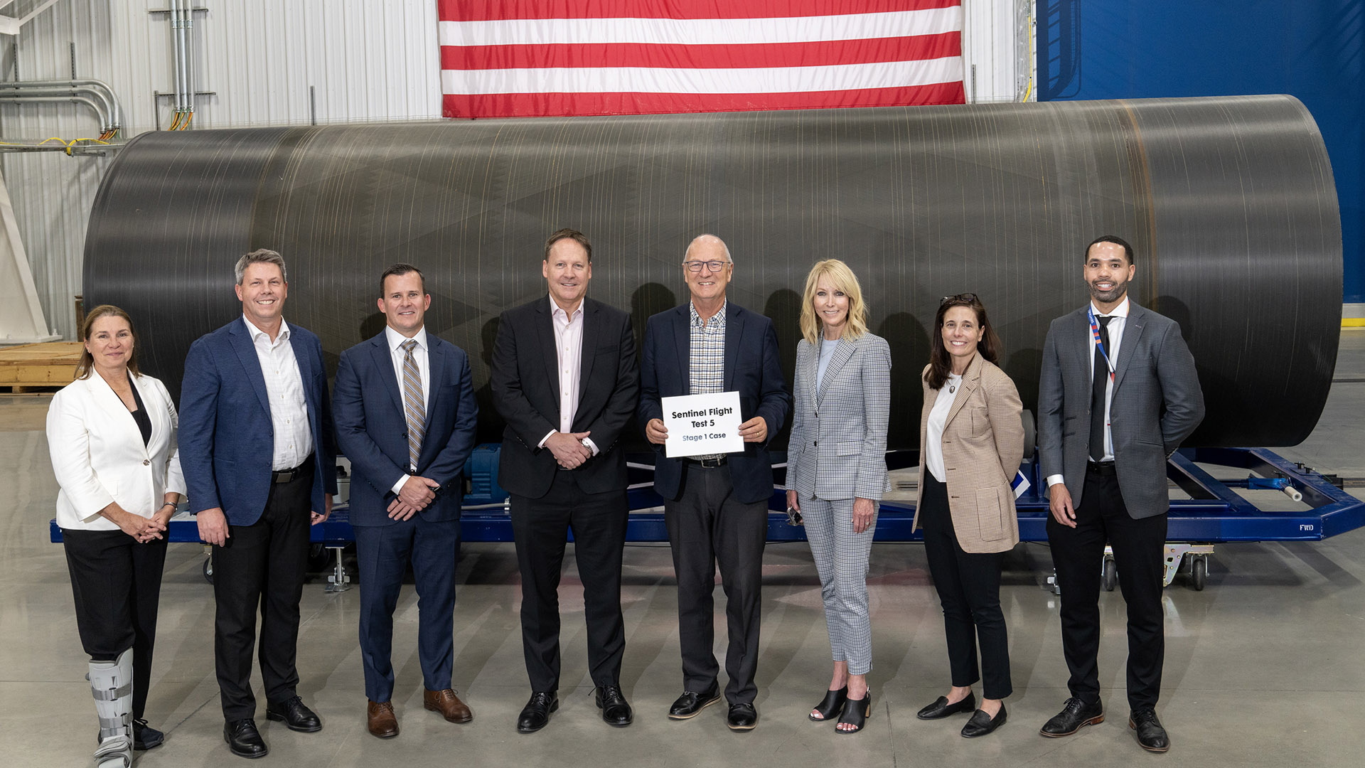 U.S. Senator Kevin Cramer stands alongside the Sentinel Flight Test 5 Stage I Case